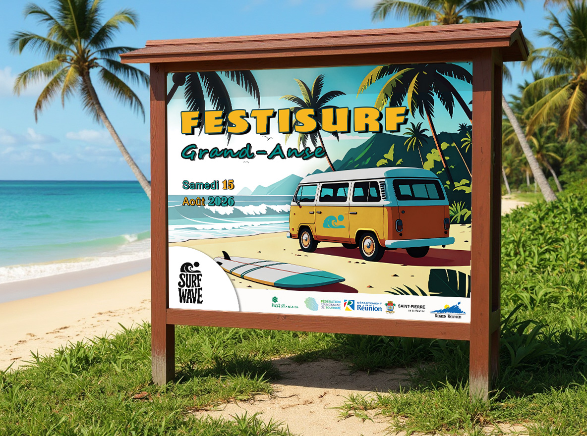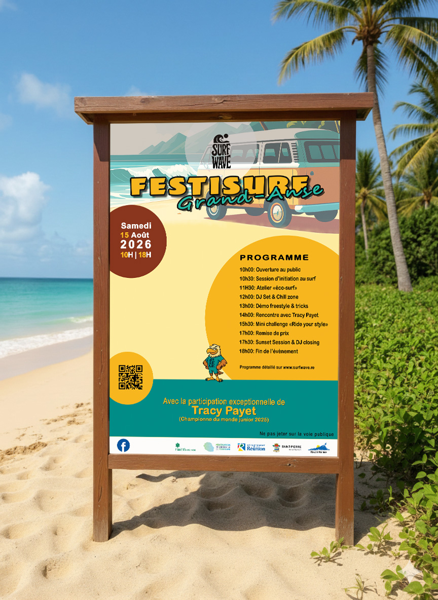 Le FESTISURF de Grand-Anse est un événement fictif organisé à La Réunion, célébrant la culture surf, la musique et les sports de glisse. J’ai été chargé de créer l’identité visuelle de l’événement, incluant le logo et les affiches promotionnelles pour communiquer sur la date et l’ambiance festive.